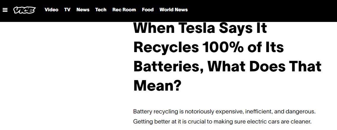 美國雜誌《Vice》在其2021年的報道中指出,目前回收鋰離子電池(以及回收普通電子產品)是一個困難的過程,且大部分材料都是降級迴圈( downcycled)的。這意味著從電子產品中回收的材料不一定會回到電子產品裡。此外,大多數電池的主要成分鋰是一種負責產生電流的導體,為裝置提供能量。但由於它的外層原子層有一個額外的電子,它不斷地閃爍到其他元素上,這使得它很難從電池中的其他成分中分離出來,比如鎳、鈷和鋁。