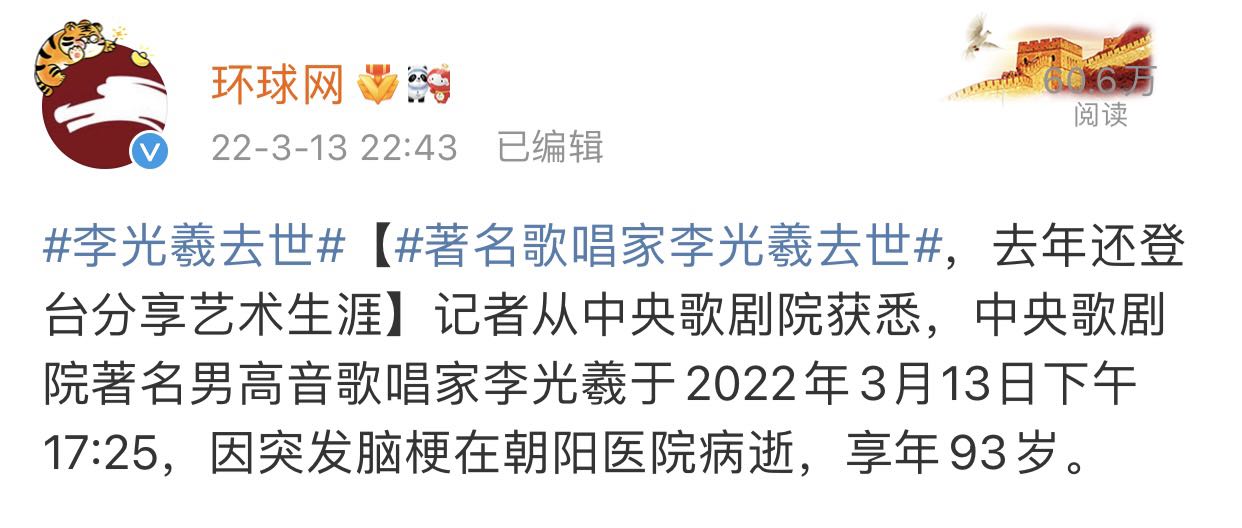 3月13日,環球網官方微博從中央歌劇院獲悉,中央歌劇院著名男高音歌唱家李光羲因突發腦梗在朝陽醫院病逝,享年93歲。
