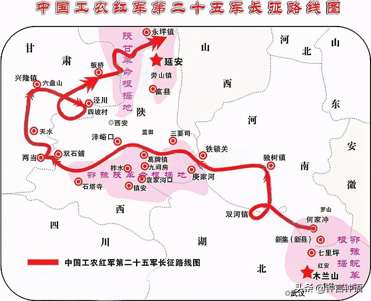 我們看看紅二十五軍的長征路線,發現其是很獨特的。其它紅軍都是沿著四川西部的雪山草地北上的,而徐海東指揮的紅二十五軍卻是從中原腹地直插北方。