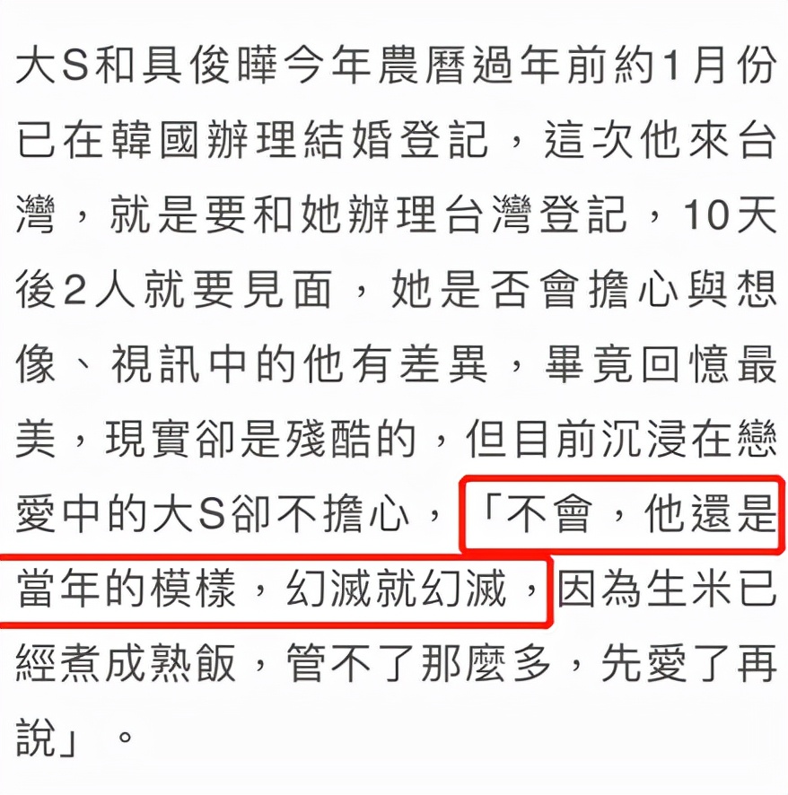 然而,大S就是“戀愛腦”一枚,不動聲色把身份資訊寄去了韓國,和具俊曄來了個“雲結婚”。還回應道“生米已成梳棉,幻滅就幻滅。”