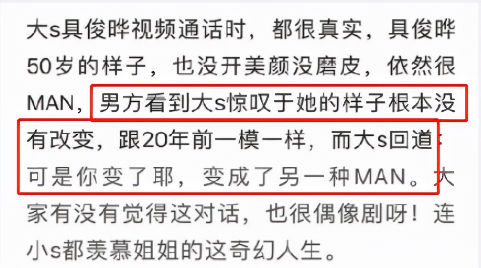 有網友直言,大S的眼光似乎也很奇特,具俊曄目前已經有53歲,在外人看來就是小老頭一個了,但大S在和具俊曄視訊時,直言具俊曄變了,變成了另一種MAN。